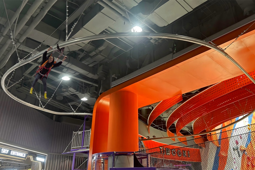 高空飞索,也叫原子飞车、丛林飞索、飞林速降、飞轨穿云、旋转溜索、丛林溜索等别称。流畅的滑轨及未来造型的滑车给人很强的科技感,均匀的时速使整个过程长达数分钟,尽情饱览山景而且有惊无险,给参与者极高的价值感,整体而言飞轨穿云的体验感远远大于溜索和滑道,参与者仿佛在林中自由的飞翔。